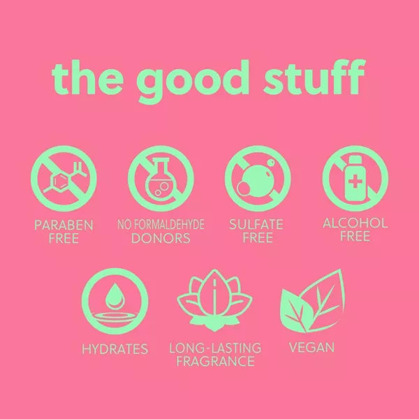 - Vegano, sin parabenos, sin sulfatos, sin alcohol y sin formaldehído.