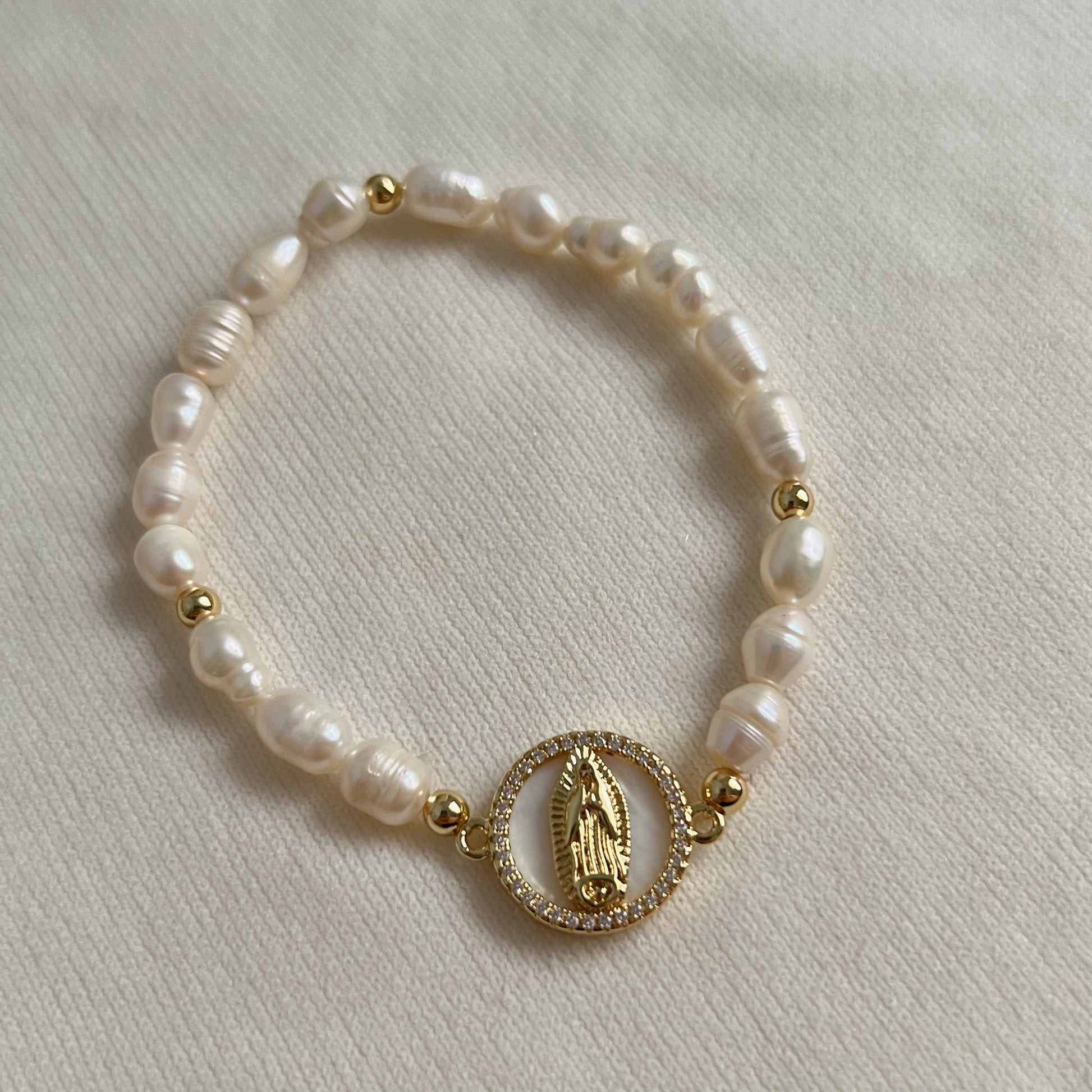 Pulsera de elástico con perlas de río con dije de nácar de la Virgen