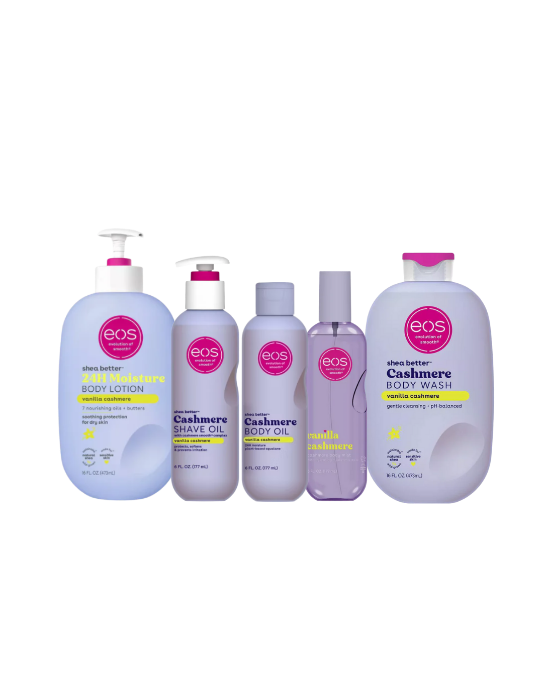 set Vanilla Cashmere de EOS con gel de baño, aceites, crema corporal y body mist. Hidratación profunda y aroma cálido para tu rutina diaria.